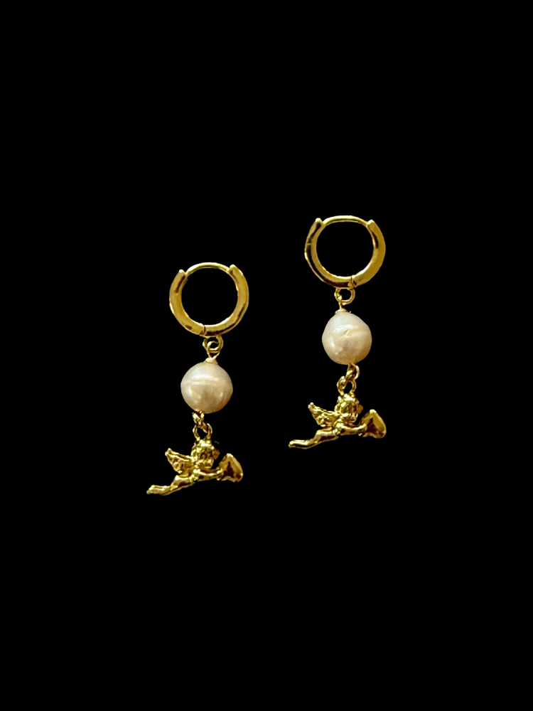 Made with 12mm 14k gold filled huggie hoops. Gold filled mini cherubs and high grade baroque freshwater pearls.
