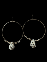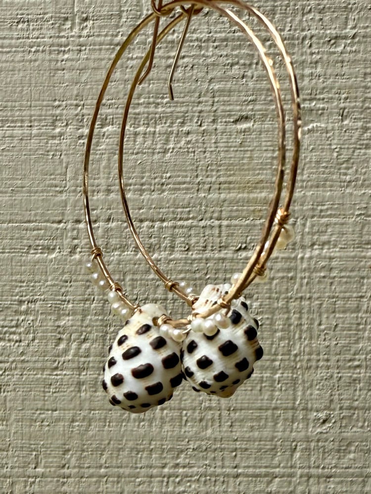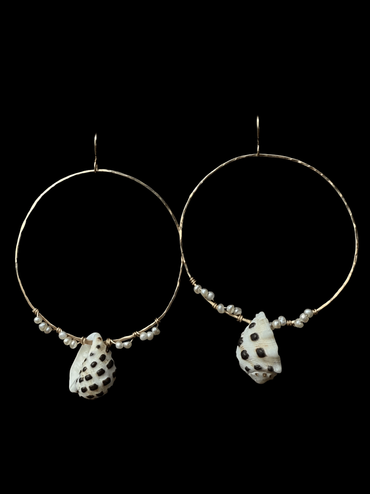 Made with 14k gold filled earrings and hoops. Hopps are soldered and hammered by hand. Tiny freshwater pearls and drupe shells found on the Hawaiian islands. Diameter of hoops is 2 inches.