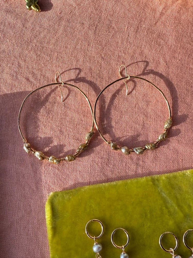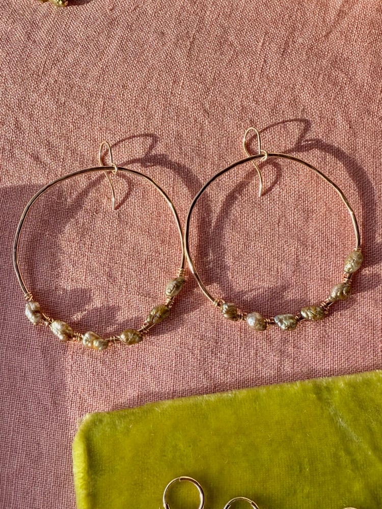Made with 14k gold filled earrings and freshwater pearls. Hammered, soldered and wire wrapped by hand. Hoops are 45mm.