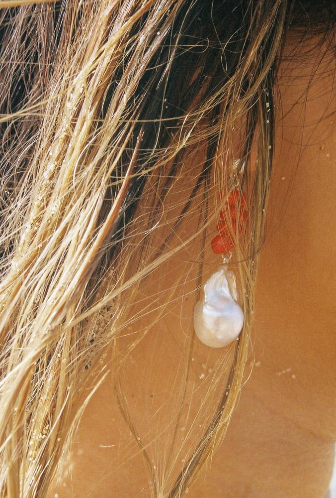 Made with sterling silver, red ceramic beads and high grade baroque freshwater pearls.