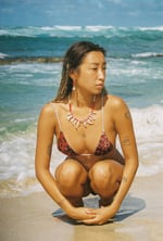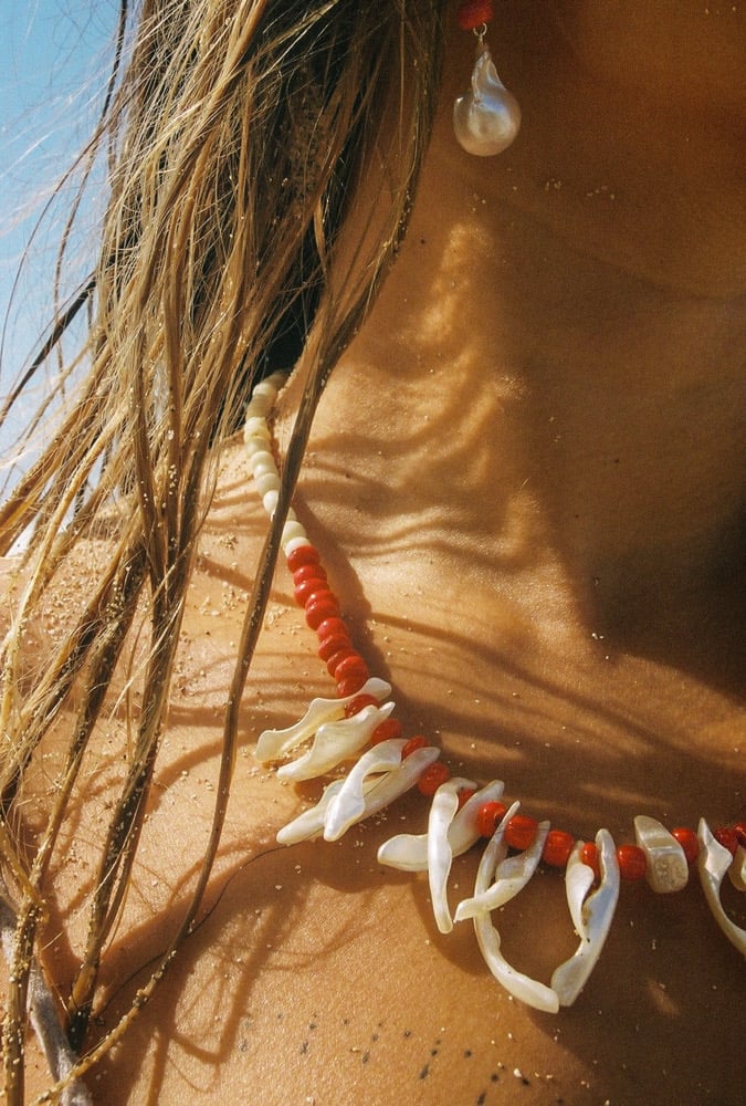 Made with vintage mother of pearl, ceramic and fish bone beads. Sterling silver hardware.