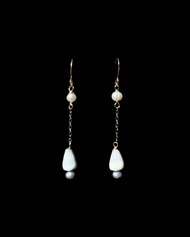 Made with 14k gold filled earrings and chain. High grade freshwater pearls and shells found on the Hawaiian islands.