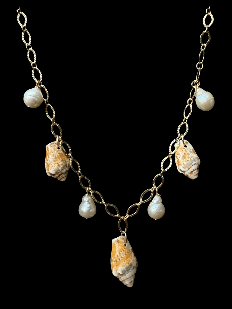 Made with 14k gold filled chain, high grade freshwater pearls and shells found by hand on the Hawaiian islands.